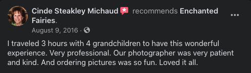 Enchanted Fairies' artists reserve exclusive studio time to provide you with our very best, personalized one-on-one service while we create your family’s artwork. We are currently experiencing overwhelming demand. Your child’s confidence-boosting magical session with Enchanted Fairies is a truly one-of-a-kind experience.