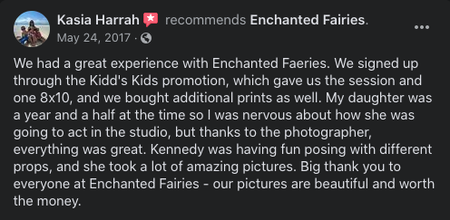 What you get with all this: your kids get to dress up, get access to our selection of gorgeous dresses, flower crowns, wings and the entire magical experience of an Enchanted Fairies session with your very own certified Enchanted Fairies photographer.